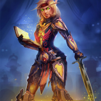 flame designs and a skirt that appears to be made from feathers or similar materials. She is holding a sword in her right hand and is reading