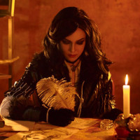dark hair and is wearing a long black outfit with some details that could indicate mystical or magical elements. The setting suggests
