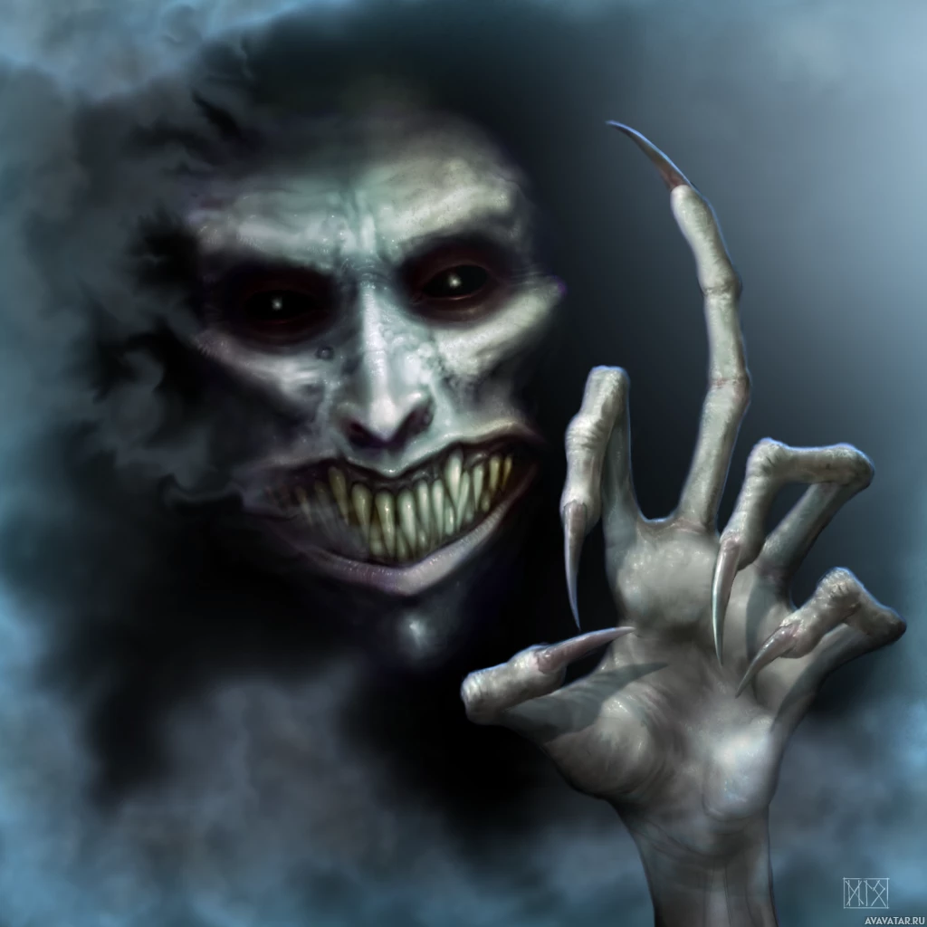 sharp teeth, and its hands are raised as if in a gesture of greeting or hailing. The background has a ghostly blue tint and is filled with