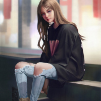 casual attire, consisting of a black top, distressed jeans, and boots. Her posture is relaxed, with her hands resting in her lap and her gaze directed away from the viewer, giving her an introspective or contemplative appearance. The setting suggests