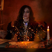 various objects on it, which could suggest that they are portraying a role associated with mystical or magical themes, such as a fortune teller or an alchemist. The lighting and composition of the photo give it a moody and mysterious atmosphere.