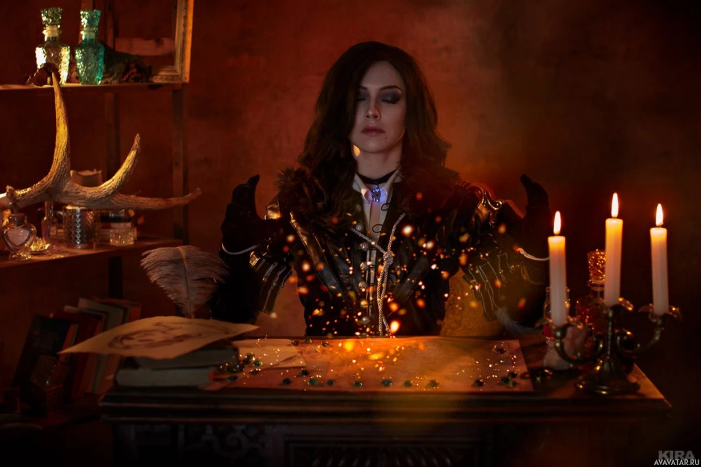 The image shows a person dressed in what appears to be a costume inspired by the character Yennefer from "The Witcher" series. They are standing behind a table with
