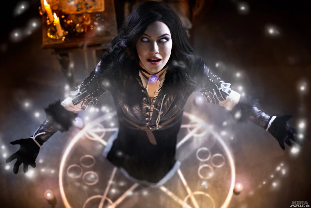 In the image, there is a person dressed in a costume that resembles Yennefer from "The Witcher 3: Wild Hunt"