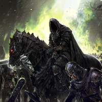 На картинке изображена фантастическая сцена с бронированным всадником верхом, ведущим группу воинов или рыцарей. Атмосфера кажется темной и жуткой, предполагая, что это может быть битва или квест в сверхъестественной обстановке, где присутствуют зомби. Фигуры облицованы средневековой броней, что указывает на период времени или тему этого фэнтезийного произведения.