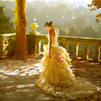 a special occasion. The dress looks elaborate and ornate, which may indicate that this photo was taken at an event such as a wedding or formal