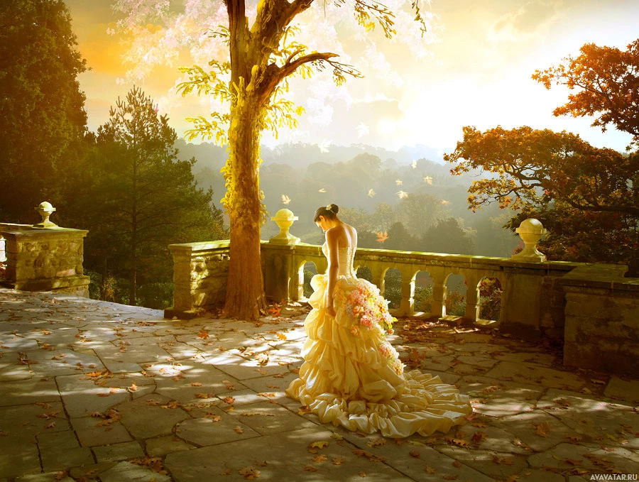 a long dress with flowing material. They are standing in a garden or park setting during what appears to be