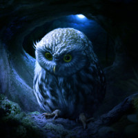 The image features an owl perched within what appears to be the entrance of a cave or crevice. The owl is depicted with its head turned, giving it a thoughtful or curious expression. The background has a misty and dimly lit appearance, which adds a sense of mystique to the scene. It's a stylized image that showcases the owl as the central figure in this naturalistic setting.
