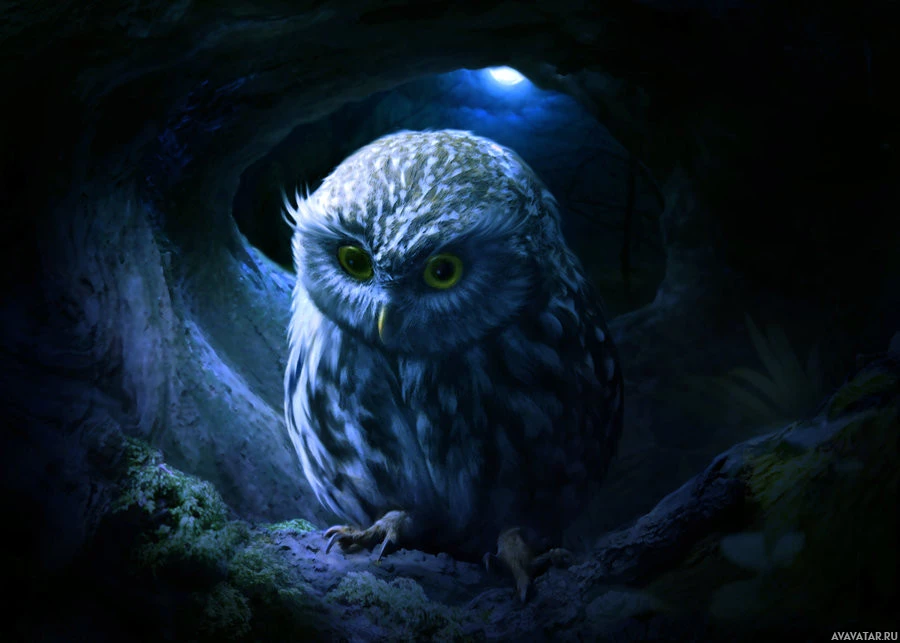 На картинке изображена сова, расположенная внутри того, что кажется входом в пещеру или расщелину. Сова изображена с повернутой головой, придавая ей задумчивое или любопытное выражение. Фон имеет туманный и тускло освещенный вид, что добавляет ощущение мистики к сцене. Это стилизованное изображение, которое демонстрирует сову как центральную фигуру в этой натуралистической обстановке.