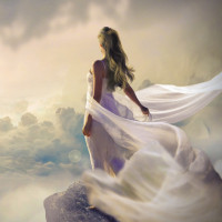 rocky outcrop with her dress flowing in the wind. She is looking into the distance, where there appears to be an island floating in the sky, connected by a bridge. Below the island, a castle is visible, suggesting the island might be floating over a lake or
