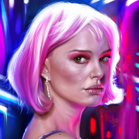 the vibrant colors and high contrast. Her expression is serious or contemplative, looking slightly to her right. The background suggests a neon-lit environment, which could be interpreted as futuristic or in line with a certain aesthetic commonly found in modern
