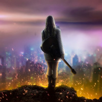 The image shows a person from behind, holding a guitar. They are standing on a hill or overlooking a scene with a cityscape below, possibly signifying destruction or chaos, as the background is fiery and explosive. The individual appears to be looking out towards the city, conveying