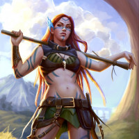 a leather armor with a skirt, boots, and a belt with pouches, indicating that she might carry supplies for traveling or fighting. In her hands, she holds what looks to be a spear or staff, which could serve as both a weapon and a tool while exploring the wilderness or engaging in combat. The background depicts
