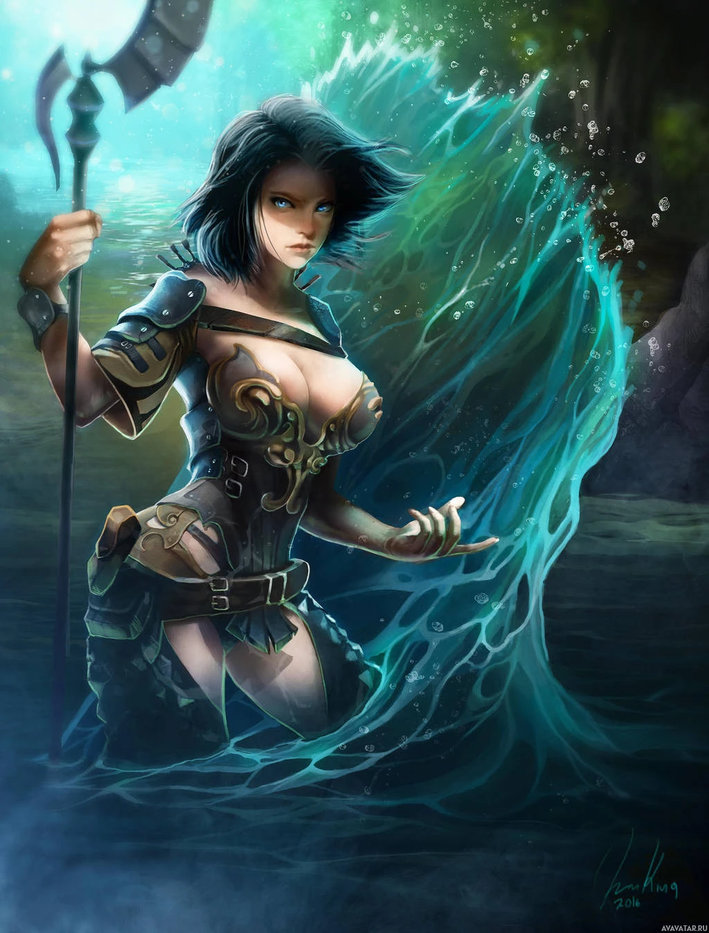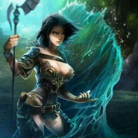dark hair and appears to be standing in a body of water, possibly a pool or a shallow river. The character is dressed in armor with a leather-like appearance and seems to be casting a spell or using magic. She holds a staff in her right hand, which suggests she might have