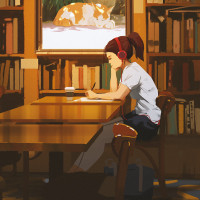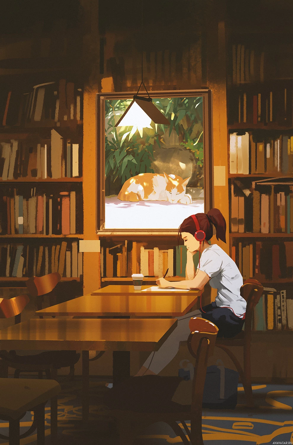 red hair, wearing headphones. She is sitting at a table in what appears to be a cozy library or study