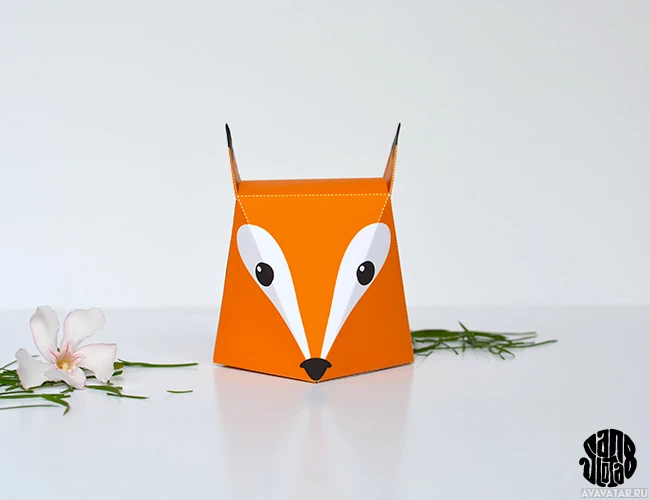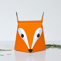a red fox-shaped bag or box, which appears to be made of cardboard. It has two