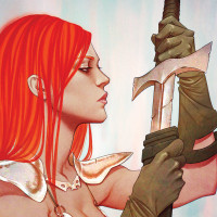 The image depicts a female character with red hair holding a sword. She is dressed in what appears to be armor or protective clothing, suggesting she might be a warrior or a figure of some significance within the context of the artwork or narrative associated with it.