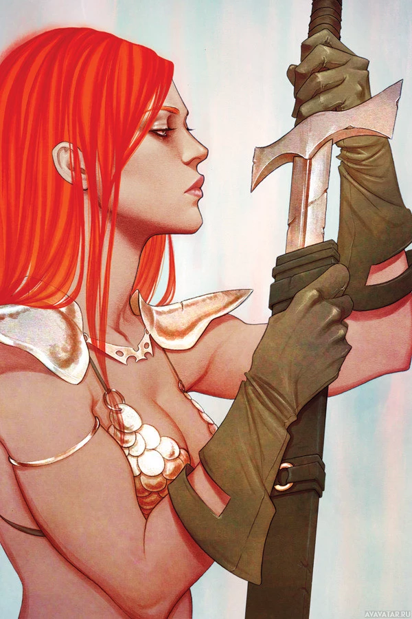 На картинке изображена женщина с рыжими волосами, держащая меч. Она одета в то, что кажется доспехами или защитной одеждой, предполагая, что она может быть воином или фигурой некоторого значения в контексте произведения искусства или повествования, связанного с ним.