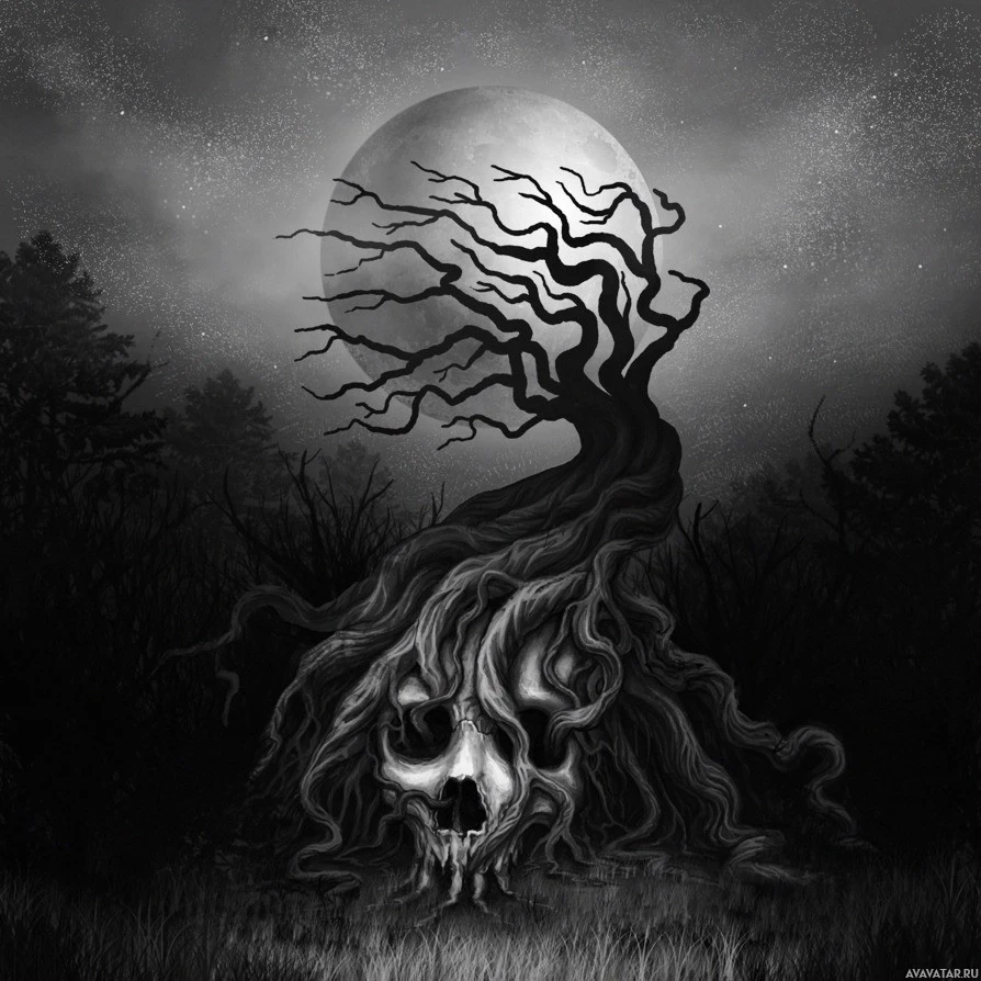 The image features a dark and moody scene. In the foreground, there is a skull sitting at