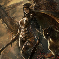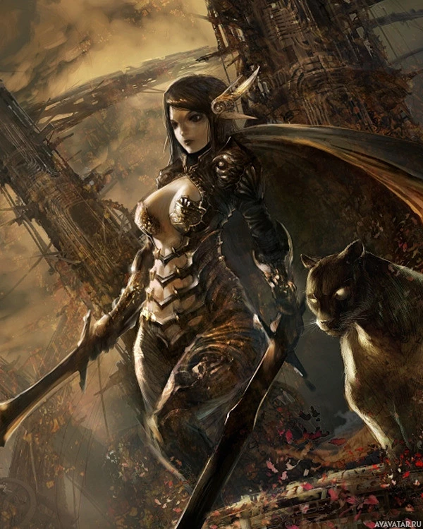 a female character who appears to be a warrior or adventurer, wearing armor and holding a sword in her right hand. She has pointed ears like an elf, and there's a panther at her feet. In the background, there are ruins or