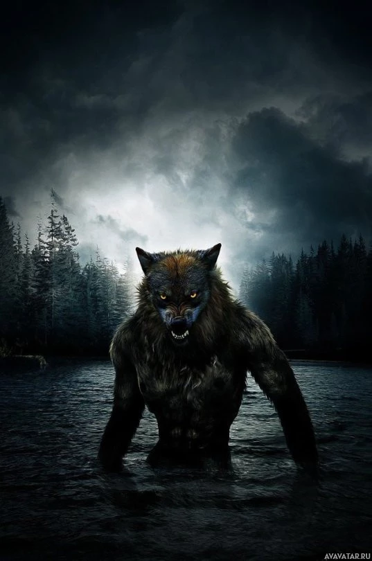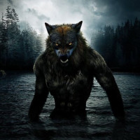 muscular build and a humanoid posture, suggesting it is in its transformed state from human to animal form. It stands on its hind legs in shallow water, which adds