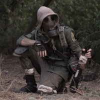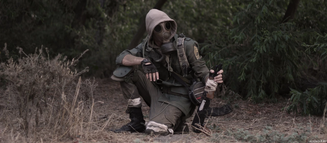 an assault rifle. A respirator or mask is visible over their face, indicating either