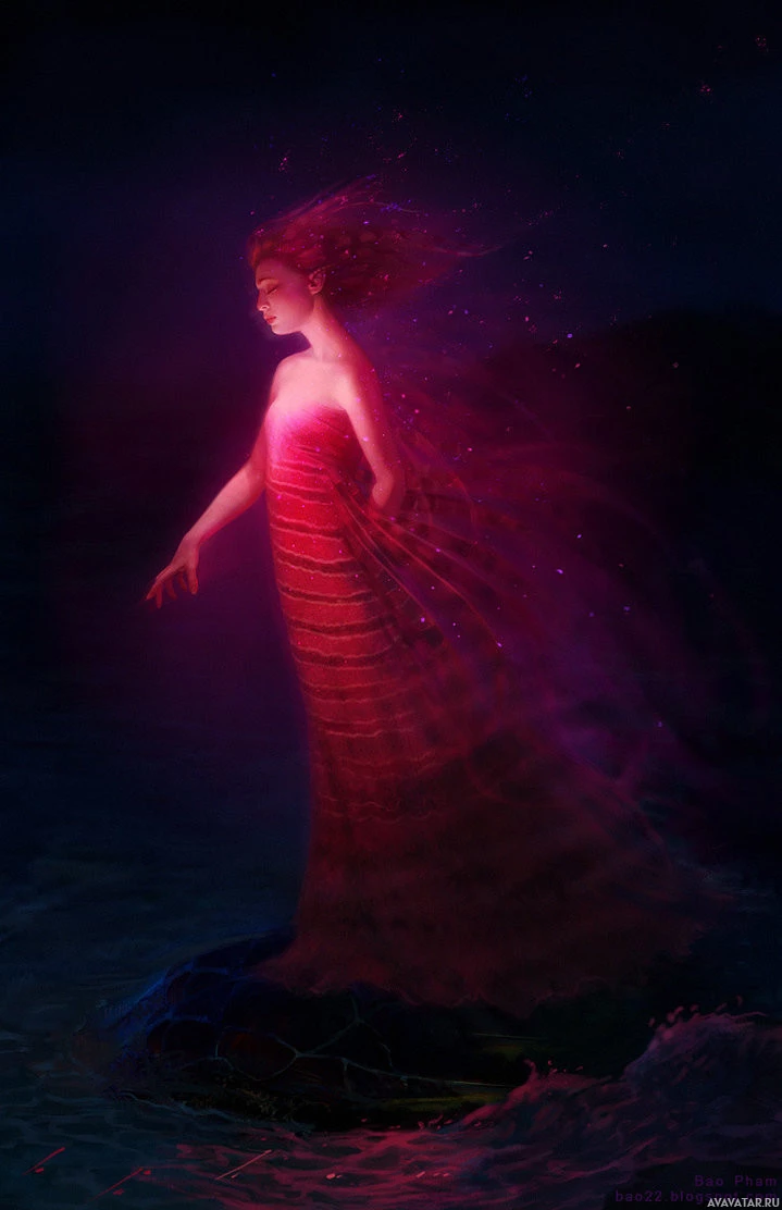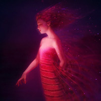 pink hair and is dressed in a flowing red gown that matches the surrounding environment. The background is dark and filled with a swirling