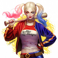 iconic suit. There are also visible tattoos on her arms, which is a characteristic feature of Harley Quinn. The artwork has