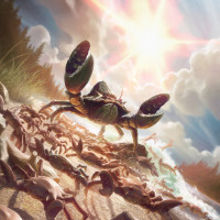 an animated scene with a large crab as the central figure. It appears to be leading or commanding a group of smaller crabs that are scattered across the beach and into the water, facing away from the viewer as if in motion or following an order. There is also a hint of vegetation and