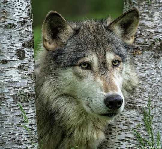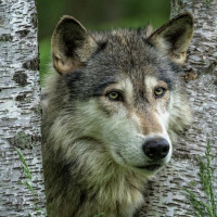 The image shows a wolf looking intently towards the camera. The wolf is partially obscured by what appears to be birch