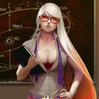 blonde hair wearing glasses and holding a book. She is dressed in what appears to be a teacher's outfit, complete with a tie and a skirt, and there's
