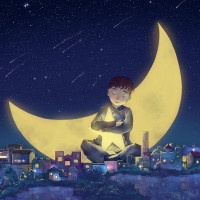 The image depicts a nighttime scene with a child sitting under