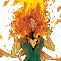 superhero character with fiery hair and flames emanating from her head. She is depicted in