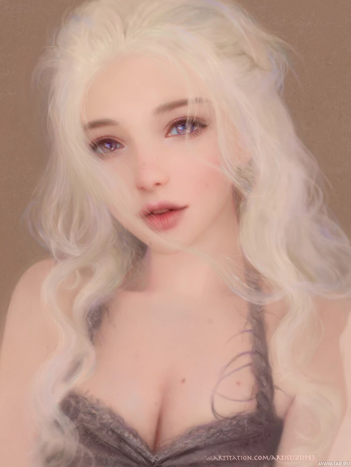 Картинка показывает персонажа, который, кажется, Дейенерис Таргариен из телесериала «Игра престолов». Она известна своими длинными светлыми волосами, и в этом конкретном образе она имеет более молодую внешность со светло-голубыми глазами. Персонажа изображает актриса Эмилия Кларк.