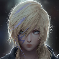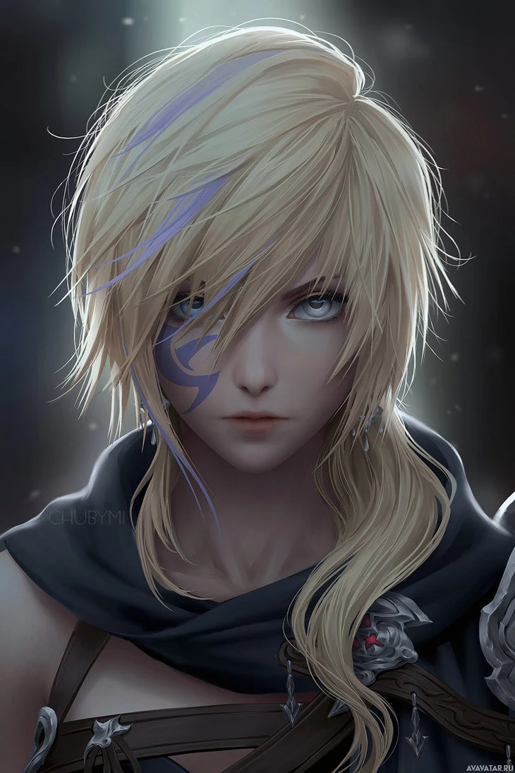 blonde hair and is wearing what looks like armor, suggesting she might be a warrior or fighter of some kind. There are also designs on her face and armor that could indicate