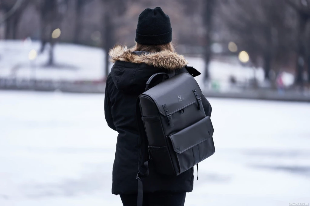 a black jacket and has a backpack on their back. There's snow visible on the ground, indicating it might be winter. The scene looks like it could be a city park or similar