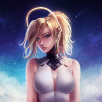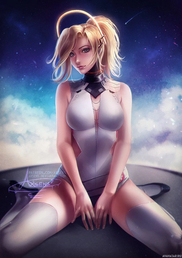 the game Overwatch. The character is depicted in her Mercy outfit, which includes a white bodysuit with