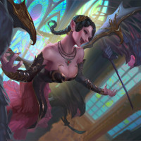 На картинке изображен фантастический персонаж, который кажется вампиром. Персонаж имеет вытянутые клыки, заостренные уши и украшен темной одеждой и тем, что кажется плащом или плащом. На заднем плане есть богато украшенная структура, которую можно интерпретировать как часть готической или фэнтезийной обстановки. Есть также существа, похожие на птиц с острыми когтями, видимыми на переднем плане. Изображение богато деталями и имеет динамическую композицию.