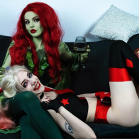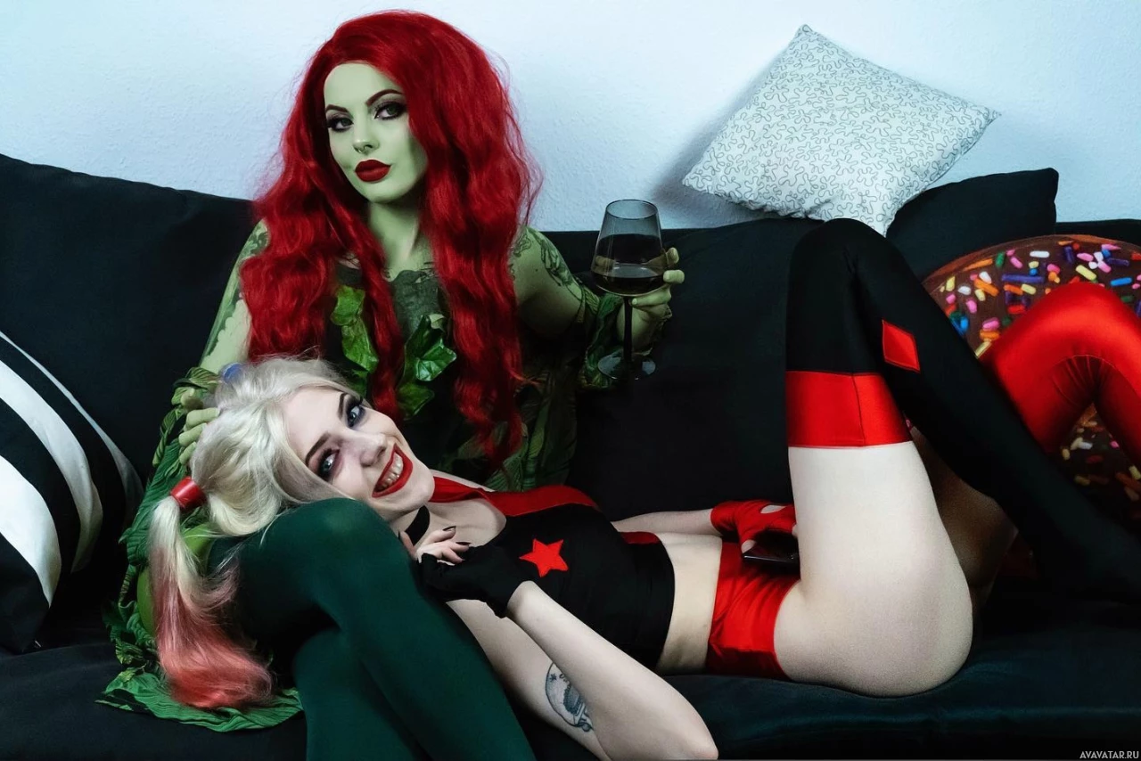 a prominent villain and antiheroine portrayed by various actresses such as Uma Thurman, Pamela Isley in the comics created by writer and artist Bruce Timm. The two individuals are sitting close together on a black couch with white throw pillows, one of which has a small image of donuts. Both characters are holding objects related to their personas: Harley Quinn is holding a pink prop that resembles a mallet or club, while Poison Ivy is holding what appears to be a small plant with green leaves. The overall atmosphere of the photo suggests a fun and playful cosplay event or gathering, where enthusiasts dress up as their favorite characters from movies, TV shows, or comic books.