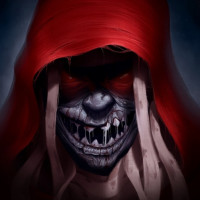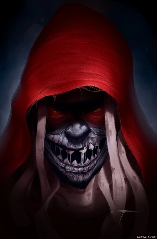 hooded cloak, reminiscent of the Red Hood from folklore or popular culture. The character's face is obscured by the hood and features a menacing expression with exaggerated teeth and