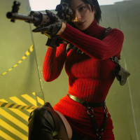 In the image, there is a woman who appears to be in character as Ada Wong from the Resident Evil video