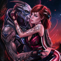 a robotic arm, suggesting that it might be one of the synthetic characters called Geth. The other character seems to be a human female with