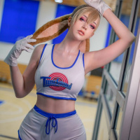 Lola Bunny, a character from the "Space Jam" franchise. The individual is wearing a costume that features a short-sleeved