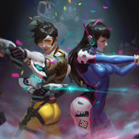Mech suit and her ability to use it as a weapon; on the right, there's Tracer, a speedster hero with time manipulation abilities that allow her to move quickly through time. Both characters are holding guns, suggesting they might be in combat or a playful pose within