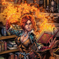 red hair, dressed in what appears to be armor or adventurer gear. The character has a flame emanating from her hand, which could suggest she has some fire-