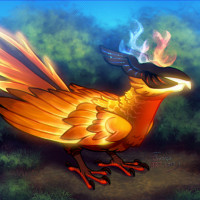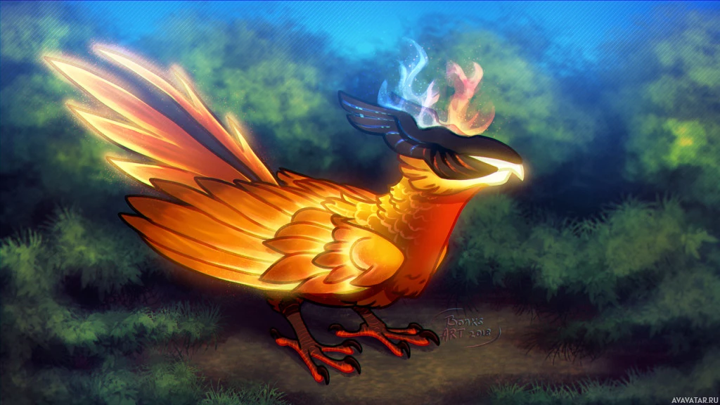 an animated character that appears to be a phoenix from the game Dota 2. The phoenix is depicted with bright orange and