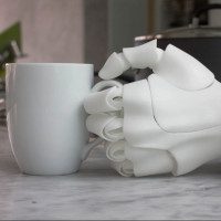 a cup of coffee. The hand is designed to look human-like, with fingers that are articulated and possibly equipped with some kind of gripper mechanism. It's positioned over the cup, which seems to be on