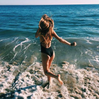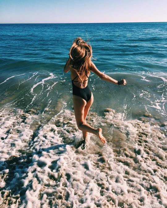 a dark swimsuit and has her hair tied back, allowing it to flow behind her in the wind. Her hands are slightly raised as she moves, suggesting an energetic or playful activity. The background reveals
