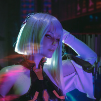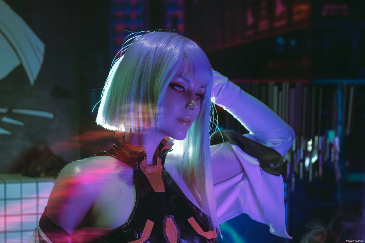 The image features a character cosplaying as Lucy from Cyberpunk 2077. The individual is wearing a futuristic outfit with elements that suggest