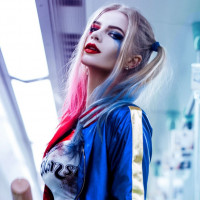 Harley Quinn, a character from the Batman universe. This cosplay is known for its vibrant colors, including her blue and yellow jacket, her red and black outfit with fishnet stockings and thigh-high boots, as well as her iconic