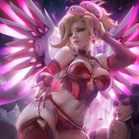 a confident posture, holding her hands on her hips, and the overall style suggests she is meant to represent Mercy from "Overwatch," a popular team-based first-person shooter game developed by Blizzard Entertainment.